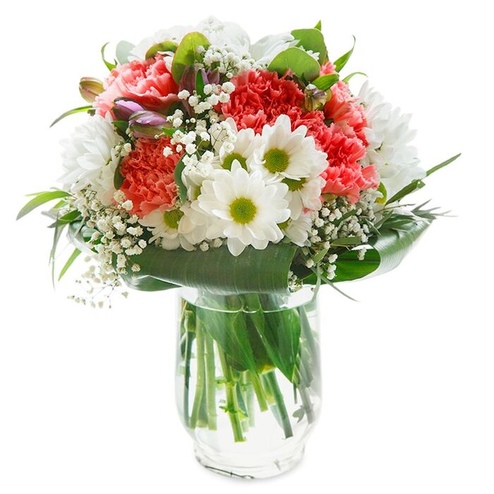 Experience harmony and elegance with our exquisite flower arrangement. This bouquet showcases a beautiful mix of snow-white chrysanthemums, delicate gypsophila, and soft pink carnations, all gracefully arranged with lush aspidistra leaves.
